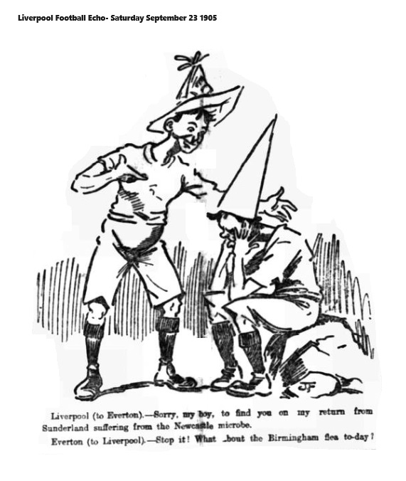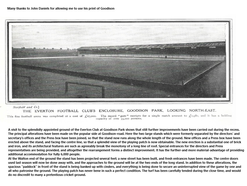 Here the Blue followers will mediate a while, and the Liverpool man will chime in with, “Yes; and the year before that we beat you both times. And going a stage further in the past you will find us sharing the 4 points possible, as also in 1896-7.” And so ends the heated argument, which brings them little nearer to the spot from whence they started.