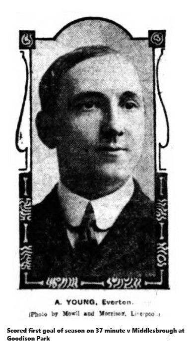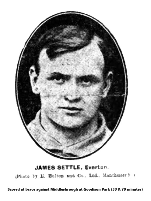 There was a crowd of well over 20,000 spectators the opening game Goodison Park. Thanks to the admirable goal-keeping of Williamson, the visitors repelled some early attacks by Everton. Everton, however, asserted themselves in uncertain fashion, Young opening the scoring for them, and Settle putting on second point. Everton at once pressed when the players returned the field, Williamson having to save from Settle, and Young shooting just over the bar. A miskick by Crelly "afforded Common a splendid opportunity, but the latter player, with only the goal -Keeper to beat, sent his shot which Scott saved. Settle .increased the home team’s lead, and after Common had got through for Middlesbrough, Rankin, added a further point for Everton, who thus won by four goals one.