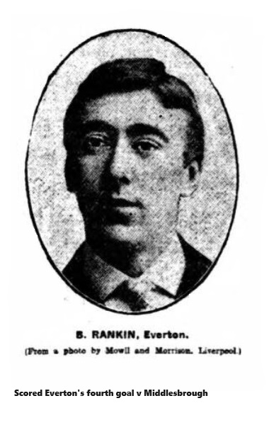 Young restarted, and the home players at once made their way to close quarters, when Settle slipped just as he was about to shoot for goal. Hardman followed up a centre of his own, and put the ball over the crossbar. Afterwards the visitors made two distinct attacks. The first one was spoiled by the ball being run over the line. The second was very cleverly checked by Crelly, and on a third occasion Green was threading his way through very smartly when he was brought to book by Balmer. The home forwards were now worming their way cleverly through the Tykes’ defence, but just at the critical moment, as McDermott put Young in possession within shooting distance, McCallum intercepted, and cleared smartly. The visitors’ right now took possession, and made a fine sweeping movement, Common dashing the ball clean through Crelly’s legs, and Scott only just cleared in time, for which he was heartily applauded by the crowd. Everton lost no time in taking up the attack again, and clever work on the line by Rankin led to Williamson conceding a corner, but it did not prove beneficial. Middlesbrough now took a turn at attack, and Cassidy sent in a pretty centre, but Scott proved smarter than Green, and ran out to effect a neat clearance. Twenty minutes after the restart Everton had worked themselves into a very favourable position, and the three inside men fairly puzzled the Middlesbrough defence, McCallum ultimately falling in tackling Settle, who swung round and defeated Williamson with a fine screw shot. Some five minutes later Commons scored for his side, this being the first score registered by Middlesbrough in Liverpool since their inclusion in the League. Rankin scored a goal from the centre by passing. Final;- Everton 4 goals, Middlesbrough 1 goal.