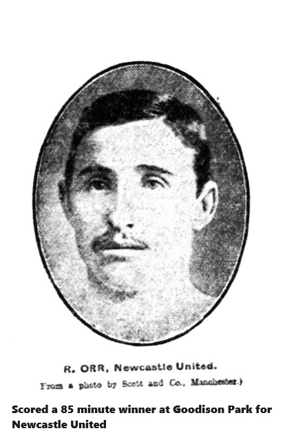The weather prior to the match was delightfully fine, although as the time for the kick-off drew near it became somewhat overcast, and long before the commencement of the game there was an enormous crowd present, and at half-past three there were something like 50,000 present. Amongst the company in the directors’ stars was the Lord Mayor of Liverpool. The teams, who came out ten minutes before time, Liverpool leading, were enthusiastically cheered. The home captain lost the toss, and Young had to kick-off, facing the sun. the first move came from the Everton right, Sharp getting down, but being beaten by Murray. Then Cox and Raybould put in some tricky work; but on the first named centring, the ball was captured by Young. Play now settled down on the Everton left, where Hardman was making excellent progress when fouled by Parry.  Abbott’s free kick landed the ball clean in the goal-mouth, but Doig fisted out valiantly. Liverpool now sped off with a splendid rush down their left, and a grand drive by Cox made the leather strike the upright. Scott was well beaten, and had Robinson not failed to get his head to the leather the Reds must have scored. The game now became fast and furious, and there were rapid incursions on both sides. Doig being once more tested. Exchanges in midfield saw Reynolds in possession, but just as Cox secured the leather he was cleverly robbed by Makepeace. A foul against Robinson was taken by Crelley, but just the Blues were closing in Raisbeck checked very finely. The ball went to Cox, who was pronounced offside, and from the free kick Hardman passed to Young, who shot wide. Just afterwards Cox got away, only to be beaten by Balmer, but almost immediately the Liverpool forwards dashed into the Everton territory. A good centre came from Cox, and then Hewitt tested Scott, who put the ball over the bar and gave a corner. This was beautifully place, and Scott had to give a further corner to save the Goddard. The second corner led to a struggle in goal, but finally Parry shot wide. An Everton attack all along the line followed, but just as Everton were driving it home Raisbeck kicked clear. Notwithstanding, the homesters came again. Just when the pressure on the Liverpool lines was becoming dangerous Raybould nipped away smartly with the leather and gave to Cox very comfortably, but the winger got too much speed on the ball, and put it out, much to the chagrin of the Red’s supporters. The Anfielders were very soon in possession once more but failed to make much impression on the Everton defence, although Cox and Raybould put in several telling shots. A nice pass in by Cox gave a sort of opportunity to both Cox and Hewitt, but the home defence was too keen, and later, when Goddard netted with a grand shot he was given offside. Now Everton gained a corner, but this was placed away by Bradley. However, when Cox obtained possession he lost the ball over the touch line. Then Doig saved from Hardman, who had received a beautiful pass from Little. When the game had been in progress some fifteen minutes the three inside men of Everton commenced to work the ball down, and finally flustered Murray to such an extent that Settle found a beautiful opening, of which he was not slow to avail himself. Shooting from mid-range, he sent a low shot straight into the Liverpool net, Doig making a gallant attempt to save, but coming to earth in consequence thereof. The success of the home team raised the enthusiasm of the spectators to a great pitch, the cheering being loud and long continued. Restarting, Bradley sent across to Cox, but Makepeace proved too tricky, and hustled “the speedy one” into touch. Then Young got off only to be pulled up by the referee. Everton now attacked on the other wing, and Murray made a bad miss which Doig coolly retrieved. Raisbeck cleared and from the centre Liverpool made ground on the left, and the leather was once more worked into the centre, when a rattling shot from Raybould forced Cox to concede a corner, which, however, without proving very dangerous, led up to a resumption of the Anfield attack, and once more Scott proved himself in brilliant form by saving from Raybould and Hewitt. Liverpool were now hanging out signals of distress in a line of defence and Murray was outwitted once or twice. Ultimately, pressed back by Settle, he passed back rather erratically to Doig, who was unprepared, and handed the leather past his goal-line, thus conceding an unnecessary corner, which led to the undoing of the Reds as their ball was nicely placed, and Doig was hemmed in with his backs, who were quite unable to get the leather away, and after several attempts had failed Abbott did the trick as he was practically in the goalmouth, and poor Doig was practically helpless. For a while after the second goal had been scored, the vicinity of the Everton goal was the scene of operation, but nothing particularly startling transpired, Cox blundering several times. Suddenly Young broke away and passed out to Hardman, whose centre was somewhat hesitated at by Young, but Sharp came on the scene and shot with tremendous force against the cross bar, the ball then bouncing right over. Just afterwards McDermott followed with a shot with which Doig had no trouble, and then Sharp had a free kick, from which he placed the ball behind the goal. Play continued to be much in favour of Everton, but at length Liverpool broke away, Cox and Raybould working well. But Hewitt being too late to receive from Cox. Liverpool then forced a corner, but failed to improve upon it, and then the home contingent took up the attack once more, Young working round Bradley and making a bold bid for goal. Again Young looked like scoring when Murray brought him down heavily close to goal, but the free kick came to nothing. McDermott, Young, Sharp, and Taylor made matters warm for the Liverpool men, and Raybould in trying to rob Sharp, gave a corner to his opponents. However, Everton failed to im