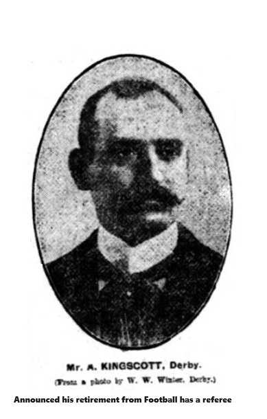 There will be many in Liverpool who will say that the announcement that Mr. Arthur Kingscott is retiring is not at all a bad thing for Everton, who somehow or other were incapable of winning matches in which he officiated. Mr. Kingscott, who has twenty six years record, has been promoted by the Midland Railway Company, and his business is of more importance to him than referee's fees. He holds the record of having officiated before the biggest crowd that ever watched a football match –the Tottenham-Sheffield United final of 1901 at Crystal Palace.