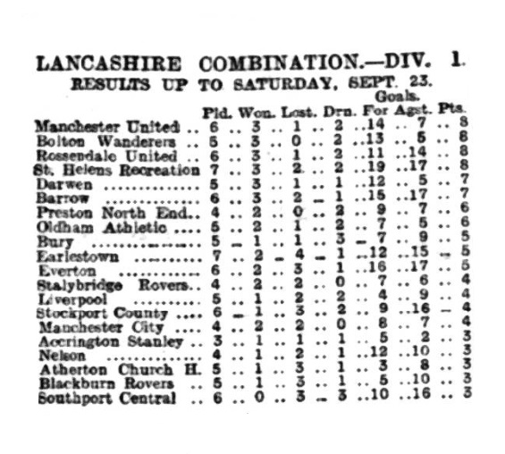The Everton reserves team have commenced the season in very disappointing fashion. Accrington Stanley, their opponents on Saturday, are a very difficult side to beat on their own ground, but in view, of the form shown by the Goodison-park team in the practice matches, it was hoped that they, would at least hold their own in their opening game. As a matter of fact, they never looked like making even a draw, and the East Lancashire side had the satisfaction of winning by the big margin of five goals to nothing. All through Everton were disappointing, and they never seemed to settle down. The bustling tactics of the opposition gave them few opportunities for combination and most of their attacks were the result of individual efforts. Stanley showed fine football, and were not long in taking the lead as the result of weak defence on the part of the visitors. Soon afterwards McLoughlin dribbled close to the home goal only to send the ball wide, and afterwards the Blues got few changes. Accrington on the other hand, played with confidence, and added four more goals. Everton falling to respond. The Goodison park team will have to show considerable improvement if they are to defeat their Anfield rivals to-day. Everton: -. Kelly goal, P.Hill, and J.Hannan, backs, Chadwick, J Wright, and W.Black, half-backs Bernie, McLioughlin, Oliver, Cooke, and Dilly, forwards.