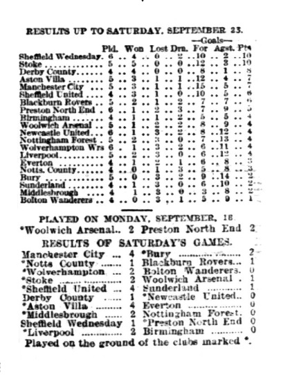 In the opening match of the season at Goodison Park Everton defeated Middlesbrough by four goals to one. The visitors were full strength, but Everton were without W. Balmer and Sharp, their places being taken by R. Balmer and Rankin. At the start Everton attacked, and Williamson, the Middlesbrough goalkeeper, had to save quite early. Then Hewitt, of Middlesbrough, got clean away, but ended his effort with a bad shot. For the rest of the first half Everton pressed, and scored through Young and Settle. Vigorous play was seen on resuming, but for the most part Everton easily held their own. Once, however, Common had a fine opportunity of scoring after a mistake by Crelly, but he sent the ball straight at the goalkeeper. Settle and Rankin subsequently added further goals for Everton, and Common got through for Middlesbrough.