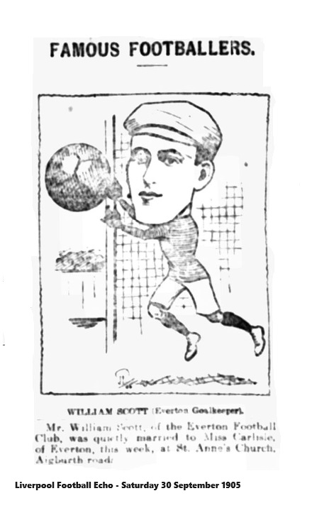 The Everton “boys” have been anxiously asking when Scott, their goalkeeper, intended to join the Benedicts. They have known the event was imminent and good-humouredly teased Scott about it, but not an inkling would he give them of the time and place. Several of them had vowed determination to witness the ceremony and accord the “leather handler” a right royal greeting. Well, it will be news to them to learn that Scott was quietly married to Miss Carlisle, of Everton, on Wednesday, at St. Anne’s Church, Aigburth-road.