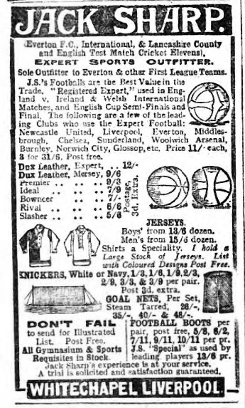 Liverpool’s lapses and their extra fixture have caused one to devote them added space this week, so that Everton must needs go on short rations for the nonce. They did quite as well as I expected on Saturday in returning unbeaten from the home of Notts County, for I always consider the Lambs as among Everton’s toughest away opponents. Impartial report says they were rather fortunate so to do in this instance, for not only did Notts exert the greater pressure, but it is asserted that a really good goal to the County was disallowed. Whether each was the fact I cannot say. But it was not too cheering to find the Everton forwards unable (as at Middlesbrough) to touch the spot. Arthur Berry appeared for the first time since his return from South Africa, and I understand he put in tome very good work, as did Turner on the opposite wing.