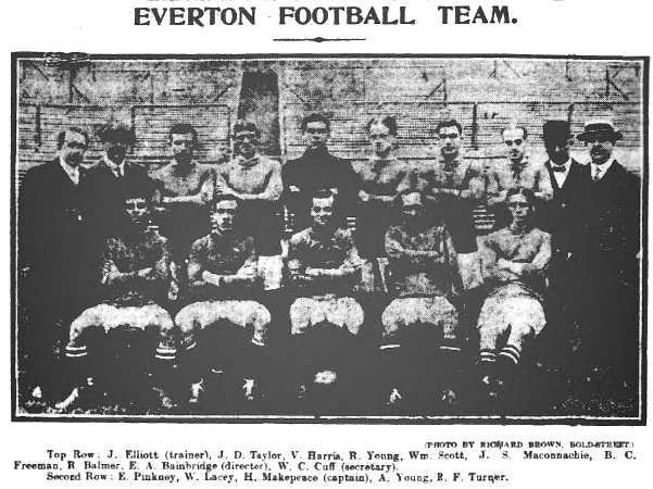 That Everton are regaining the form that won for them the championship last year was evidenced on Saturday when they defeated Burnley by 3 goals to 1. The forwards gave a vastly improved display, especially Lacey and Gourlay who believed a shooting hard and often. In the first half each side scored, Lacey for Everton and Watson for Burnley from a penalty against Bardsley for handling. The second half was Everton's, the Burnley men never being able to get going, and before the finish Gourlay placed two goals to the credit of his side. Jack Taylor made his first appearance of the season, and without unduly exerting himself played a clever and heady game. Everton: - William Scott, goal, Stevenson and Bardsley, backs, Weller, J. Taylor, and J. Davies, half-backs, Pinkney, Lacey, Ness, Gourlay, and Barlow, forwards.