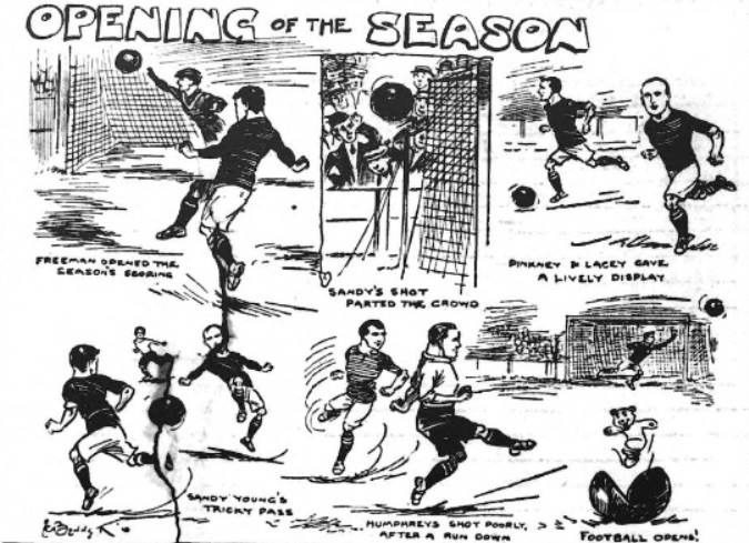 Judging from what was witnessed in the opening game last evening at Goodison Park, there appears to be pretty sanguine grounds for anticipating a successful season so far as the Everton Club is concerned. The local organisation prevailed by two clever goals, and even this margin might easily have been more pronounced but for the really excellent opposition presented by the Tottenham Hotspur custodian. Clever shots were rained at him thick and fast, and although he is built on diminutive lines, he parried these with a skill that stamped him with the hallmark of class. Taore could be no questioning the important part he played in the proceedings, and, as is always the case at Everton, the crowd, which numbered twenty thousand, did not fail to show their appreciation of his resource under somewhat trying conditions.
