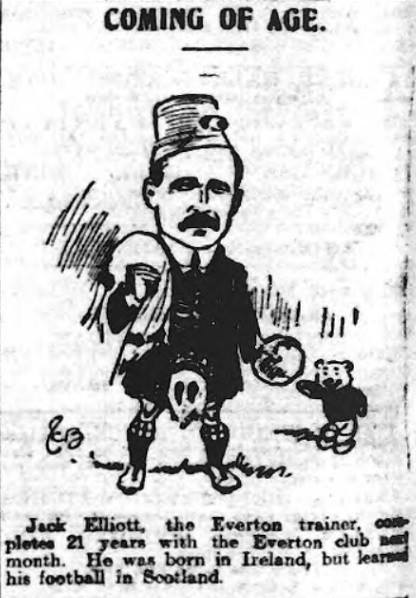 There are few who can claim to have been associated with one club in a professional was for a period of 21 years and I fancy “Jack Elliott, the popular Everton trainer can claim a great distinction in this respect. Next month Elliott comes of age in Everton's service. He has been connected with the Goodison club as player and trainer since 1889, and next month he will be able to claim the unique distinction of having served one club continuously for 21 years. This is indeed a record to be proud of and I am sure Jack Elliott numerous friends will be pleased to hear of the unique occasion. He was fought for the Blues in many a hard battle on the field, whilst in later years Elliott has trained some of the finest players ever known. He came to Everton as an outside left, and played his first match against Rawtenshall, whilst he played for the League team against Notts County. Of course in those days Milward and Chadwick were the start artistes, so that Elliott had little opportunity. However, he was a whole-hearted player and his headlong dashes down the wing will ever be remembered. He was a member of the League team on occasions but mainly assisted the Combination eleven, and he took part in games when Everton were at Anfield road. Jack proved himself a real good trainer, and I trust he will remain to look after the Everton players for many years to come.