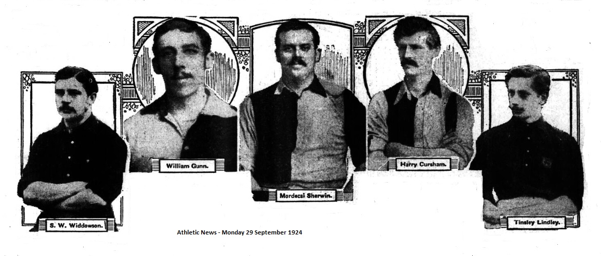 From Notts County we could take George Toone (goal); Harry Moore, Alfred T. Dobson (backs); Alfred Shelton, Stuart Macrae, Charles F. Dobson (half-backs); William Gunn, Arthur Cursham or “R.H. Venables” (the name under which he often played to conceal his identity), Fred Geary, J.A. Dixon or H.B Daft, and Harry A. Cursham (forwards)- all reading from right to left. It is true that Alfred Shelton would be out of place, and that Geary, who was a Nottingham Rangers and went to Everton, only occasionally played for Notts County. Among the Foresters I recall as men who earned caps; Jack Sands and Harry J. Linacre (goal); E. Luntley, James Iremonger (backs); Fred Forman, Albert Smith (half-backs); Tom Danks, Arthur V. Goodyear, Tinsley Linley, Sam Widdowson, and J.E. Leighton or Fred Forman. I cannot recollect any right half-back of the Foresters or “the Reds” who attained the distinction of playing for his country.