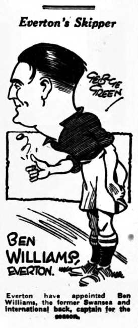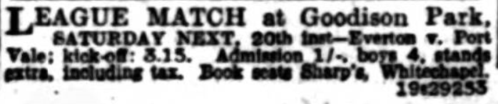 From Hastings I get this one;- I have been a very keen supporter of the Blues or the last eight years, but owing to moving South I have not been able to see Everton play very often during the past eighteen months.  This last week-end, however, I was fortunate enough to be in Liverpool and decided to go to Goodison Park again and see the good old team.  What a surprise I received when they met more or less the babes of the Second Division.  Port Vale’s forwards showed the Everton five how to play.  They were a smarter set and deserved their win, as they took their chances, and Everton did not.  Everton’s forwards were very ragged.  Everton should give a few of the younger players in the reserves a trial; they would not appoint.  As things are at present they will be getting their chance when they are old men.  Here is my team; Coggins; Cresswell, Williams; McPherson, Griffiths, Thomson; Critchley, Dunn, Dean, McCambridge, and Stein.  Britton, the clever young half-back secured from Bristol Rovers, who received a broken collar-bone in the trail match, makes his first appearance on Saturday, when Everton Reserve meet Sheffield United Reserve in the Central league match at Goodison Park, kick-off 3.15.  White and Martin will also be in the side, the team being; Sagar; Lowe, O’Donnell; Britton, Gee, Bryan; Wilkinson, Martin, White, Webster, Stein.