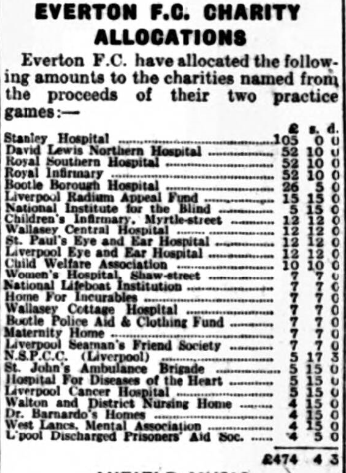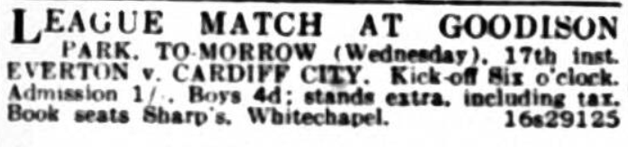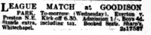 Everton will open their home Second Division programme this evening, when old friends and rivals Preston North End, will provide the opposition. What is second Division football like? I Fancy I hear many enthusiasts asking this question. They will gain a good idea this evening, when the kick off, is at 6-30. Club life in the lower ranks is undoubtedly an adventure, and though Everton made a good start at Plymouth, the way is long and beset with pitfalls and the players must set themselves for an arduous campaign. Preston on Saturday demonstrated that they have a good side, for they beat Southampton well, and it is plain that the old club is out to make a bid it will be like old times to see the clubs clashing once again, even if their present stated is nothing like it used to be. The two former Everton players Harrison and Kerr are assured of a particularly warm welcome, for the dashing play always pleased at Goodison Park. Harrison is still a powerful shot, and he is seen at his best with Penalties or free kicks near goal. The teams are unchanged, and the men will line up as follows. : - Coggins, Williams, Cresswell, McPherson, Griffiths, Thomson, Critchley, White, Dean, Martin, and Rigby. Preston North End; - Hampling, Ward, Kerr, Mesbitt, Craven, Crawford, Reid, Scott, Smith, McClelland, Harrison.
