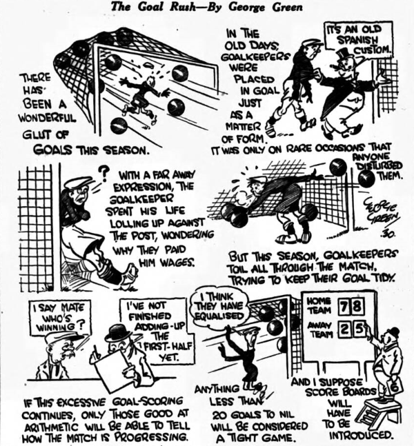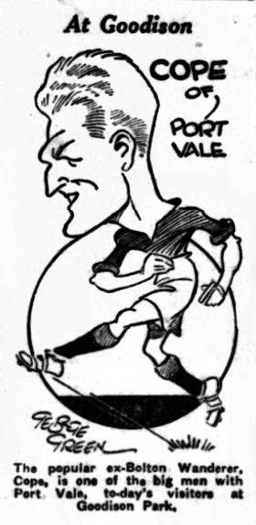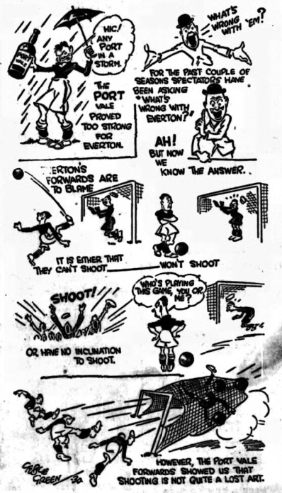 The type of Spoonerism that applies to Everton is “Tinkering teams their titles lose,” It was this tinkering, of which Everton have oft been guilty, which enabled Port Vale to turn the results sheet pink with embarrassment when the scorer wrote the result, Everton 2 Port Vale 3.  The reasons for defeat must be occupying the greatest attention of everyone.  Why should a hitherto unbeaten side fall, on their own ground –and top a side which last season played almost identically the same team in Third Division football?  It was an ironic blow, and knowing the value of iron to the system, it is possible that Everton will benefit by the shock to their system.  I mean a defeat of this kind will prevent their taking things too easily, too confidently, and too much in the way which suggests that promotion is a more matter of time.  A two goals lead in the second half was not sufficiently big to enable Everton to hold off the opposition.  In these days of football fury and recovery two goals represents a poor hurdle to a team which gets the air of victory into its head, and so Port Vale with three good shots put Everton’s chart back a point, and caused the biggest surprise of the day.  They won because they took chances.  Everton lost because instead of leading comfortably and convincingly they had shown such poor finishing form that a result which should have been safe long before the game ended was reversed in favour of the opposition.