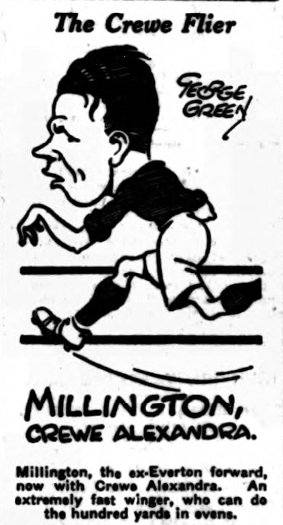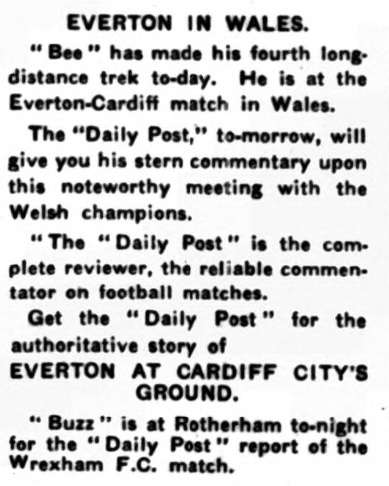 All Wrexham is agog with the rise of the Welsh side in the football world. The constant effort, the earnest endeavour of player and official, together with Manager Baynes, has led the side to a position of rare honour.  To me the side is interesting, especially as I was asked to interest myself in the club some weeks ago with their supporters’ club. Little did they know that Mr. Baynes, like many another manager, took counsel with the members of this Hive regarding the quality of Lewis, the son of a Wolverhampton man who trekked to Ellesmere Port with many other Midlanders. His son eventually left the Ellesmere club and became an Everton winger. He was a worrying outside left—hard at it, perhaps running himself out too early in his football career. Then he was tried as a wing half-back—he has bodily strength and great desire to rise in his profession.  When he was listed Mr. Baynes asked me for his birthmarks and has probabilities, and he was signed next day.  On Saturday, as the " Football Echo "  and " Daily Post " stated, Lewis scored  four goals from the outside-left position  —not five as has been stated. Needless to say, such form is sure to bring the scouts and managers to the Wrexham side, but the Welsh people are not keen to make deals; they are keen to keep their position to a point that shall bring them to the Everton level—they are yearning for a match with Everton before they leave the Second Division.  Talking of this Goodison affair reminds  me that at Hoylake they are running  some boxing shows of more than average merit, and they "bill " them in an unusual manner, as witness this saucy  little bit:—  " A smashing ten-round contest. Dick Grooms (Everton) v. Tommy Smith (Liverpool); two young boxers rapidly gaining recognition in their class. These two boys fought a draw at Kew Gardens, and the Press described the contest as the finest seen this season. This contest will be keener than any Everton v.  Liverpool local Derby. So be sure to see it. It will keep you talking until Everton come back.' Hoylake boxers meet at the Central Hall on Friday.