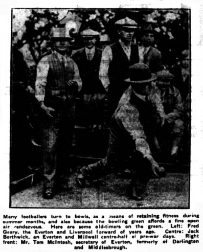 Dean is heading the ball with all his old-time accuracy; he is getting up to a ball in a heading-leap where last season he was a not short; he is nodding the ball backward to his inside forwards- and the other forwards by being up sides their centre are able to take instant shots at goal.  In an effort to get back to Division 1, home points must be all won all along the line without exception.  Tonight’s the night for the first home victory against old rivals.  But Everton must show a heartiness against rugged players who know exactly which man or men to mark- the need for practicability tonight is more urgent than on Saturday last – call is for the players to be up and doing- without undue show and without the fanciful frittering foible that was a barrier to success last season.