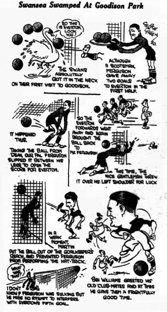 “Fed-up Blue” writes; - You are a wise guy, giving the Goodison Park farce a miss and going to Birmingham.  Why, oh! Why, does Dean get injured.  I hope he had the pleasure of seeing his colleagues playing pretty pretty football in midfield, but when they get near goal, why they couldn’t kick a hole in a wet “Echo.”  Will the Everton directors never learn a lesson.  Against Cardiff last Wednesday and now against Port Vale the same old messing about went on, while the other side score goals.  Get a few live boys who can score goals.  “A Loyal Everton Supporter” writes; it is high time directors learned what a reserve team is for.  When a first team man is injured it is the natural and proper procedure to bring in the reserve man for that particular position, especially if he is playing as well as McCambridge.  A player is injured, and then all the inside positions are altered.  “Dissatisfied” says; - Having witnessed Everton’s home games, I am unable to understand how they have secured the 11 points which have put them at the top of the League chart.  Luck has been the dominating factor in their early successes, but now a rapid decline is setting in which requires attention.  It is totally unfair to the supporters of the club to expect them to pay to see such football as that served up.  The most effective method of obtaining better-class football- although I hate to say it –would be a boycott.  “Three Blues” say; - To disorganize a whole forward line for the sake of including one man is to cry for defeat while there is a centre forward in the reserve side scoring goals every week.