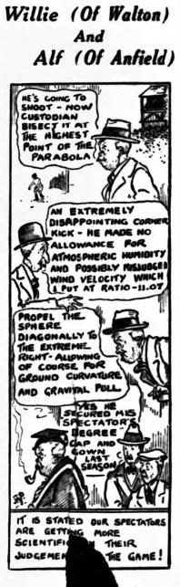 The biggest things of Saturday were defeat of Everton at home and the absence of success of the Chelsea star attackers, Wrexham’s fine margin, Liverpool’s skill and brilliance at Aston, and Louis Page’s astounding record of registering his 101st goal for Burnley in five years’ service, with only one change of scoring position-centre forward, when he got six in one game.  Louis is today showing his wares at Linacre-road, opposite Bryant & May’s; brother Tom is at 100, Bridge-road, Litherland, looking for a football job near home.  And to think these Pages were our own city boys, and that Louis yearned to play for our teams and was turned away! Funny game, football.  Doubt me?  Then ask the Everton club; yet he who reads these notes could run through the criticism of the last few matches and find that a storm was browing-a home defeat was lurking through the very urgent reason that the inside forwards were not playing well; easy chances of scoring were cast away in the belief that any old time would do.  Thus have three home points slipped out of their grip in this wet week.  Let me tell you of more pleasant things.  I yield to no one in commendation of the Aston Villa style of play over generations.  I was carried on a back to their Perry Bar performances, and I think I know their style.  Well, Liverpool not only played them at their own game, but really beat them at this on Saturday, before 34,000 admiring spectators.  If you doubt my word let me quote you men who know the game, having captained the Villa in their time.  Howard Spencer said; “I am content with the result, of course, but not with the home team’s display.  Your men played splendidly and without luck.” Mr. Devey said; “The result has gone the wrong way.  I admired the way your team played.”  I leave it at that, because these men are ardent students of football.