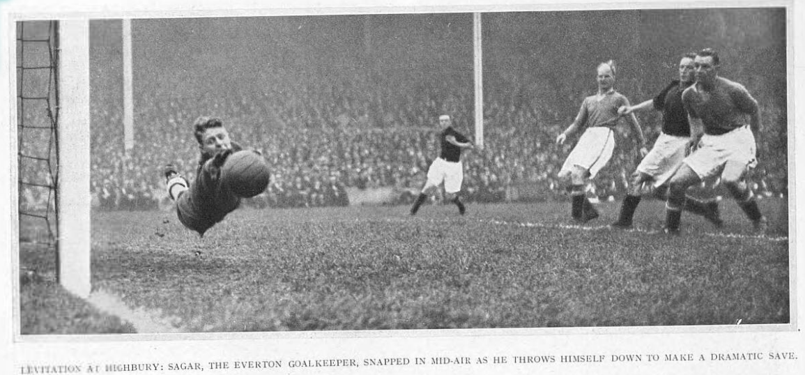 Arsenal scored two goals in two minutes. The first was an oddity; Sagar, although half-covered by a crowd of players, actually touched the ball more surely than he had done in the game versus Derby county on Wednesday. Hulme had lobbed it, but it might be that Sagar put through his own goal. It was a blow. Stern Sagar, relentless in his daring and beautiful in his leaps towards the high ball, had his moments of frailty. One minute later Jack had scored from Bastin's seemingly offside post. Arsenal now sparkled, but Cresswell thought he would take his fair share now, and while he was the towering back of the afternoon, Bocking did a lot of serviceable work. James and Jack, in quick moves, turned the game 100 yards. They don't know the word "space." The pair bewildered, and while Cresswell held on to his delightful scientific tackling exhibition, there was a chance for Everton. A goal was all they needed. Critchley offered it. Dean accepted it, but Everton had run to seed; the cost had been too great; a game that had been offered them in the first half hour was now refused them. Arsenal played fine free football and every time they were forward one feared a goal. It was no surprise when it arose through Lambert, but the quaint changeability of the game was shown by the fact that after this Bastin inclined to have a shot at goal. This outside left is one of the hardest hitting youngsters in the game. He drove in three "cannon balls," and Sagar saved them so well that he left the ground with a rare volley of applause, and the crowd the day's wobbling game, Critchley missed a chance of scoring through slowness with the last kick. So Critchley had got a gaol he should not have got, had not got a goal, he should have got, and he given Dean the vital goal that made a draw possible.