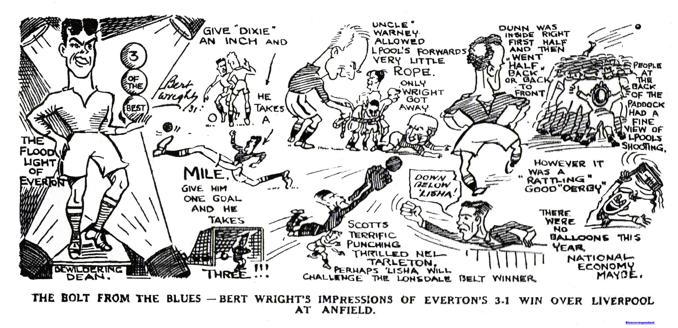 By "Bees."Everton found Derby County very difficult to hold, but the local side gained the points by the odd goal of three. The County side had youth, pace, and enthusiasm. They work swiftly and to the point –the goal area. There they did not fare so well as a week ago when they were conquerors by 3-0, and Bowers got the 3 goals. This time, in the return game, Bowers had little chance. Bocking, with his solid and sure style, is at the moment stronger than it has been for many seasons. There is a good working agreement between the backs. Cresswell's nochanlant robbery of the ball from Bowers, who was going hot pace towards goal, was typical of the man. Bocking was not so stylish, yet he was quite effective even if he was once nearly caught napping. Derby County were not out of the prizes when defence was concerned. Copper the international back gave another studied and studions display of five resolute kicking, but his forward line was unbalanced, and his team generally did not respond to his example, Mee for instance, hardly being seen through the match, possibly through the absence of his usual co-worker, Lewis, ex-Huddersfield. Everton were not exactly satisfying any more than the game touched high spots. There was a lot of poor football and needless delay on the part of Everton, and with Derby at times rushing at too great a pace to allow them a conclusive effort towards goal making the game dragged quite a good deal until Derby made a fighting finish. Derby got a goal through Bowers snapping up a half chance, when Sagar might have punched clear, but conceived the idea of trying to make a catch.