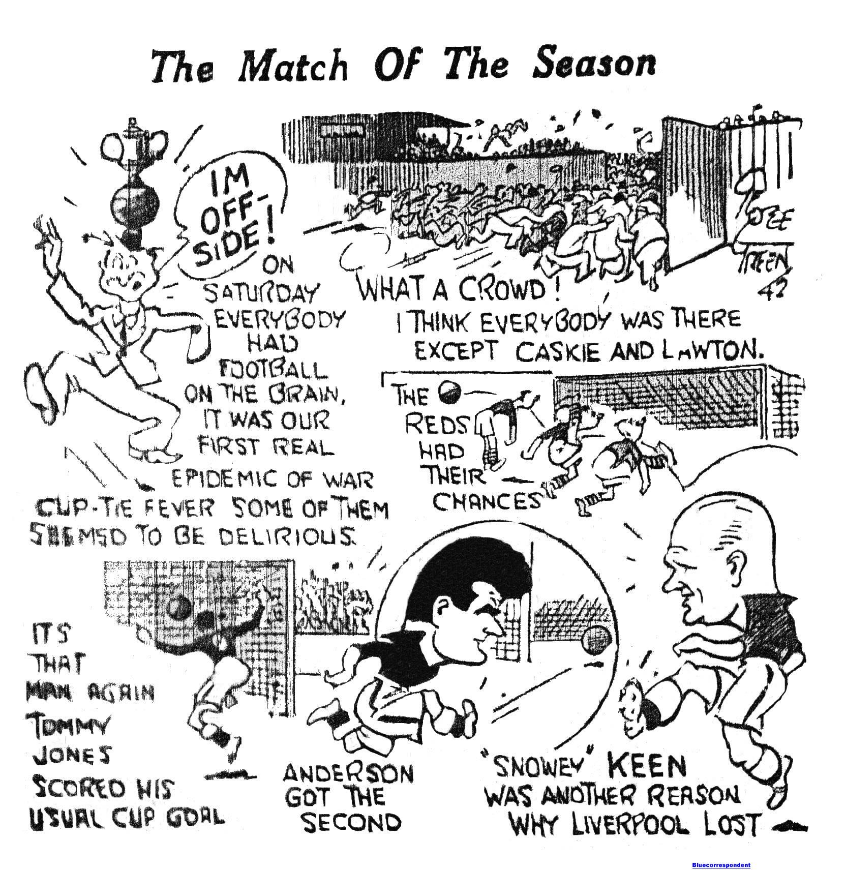 It was thrilling football all through full off excitement and incidents and fought out in clean and sporting fashion. The crowd of 33,445 (£2,181) was a war-time record, and the spectators fully enjoyed this throw back to the pre-war time atmosphere. With the defence on both sides superior to the attack, the game did not produce any outstanding best forwards. Nieuwenhuys was Liverpool’s most dangerous attacker, and Haydock was a grand worker, but Done Was disappointing, and failed badly several times with easy chances. Kaye and Taylor were sound wing halves and the rearguard was good, Hobson made a splendid penalty save in the closing stages when Cook although presented with a second chance from the rebound, could not get the ball past him. Next to Burnett’s superlative display, Everton were best served by Keen and Jackson.