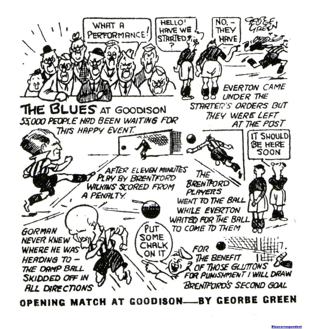 Mercer, object of most conversation in the crowd, offered the classic pass of the afternoon, worked in his own distinction style. Like others, he could not get his other passes right perhaps because some of the forwards took up foolish positions – they tended to go into the built-up areas, instead of the open spaces. No this was not Everton’s day and it will not recur if the team become more practical more connected, and more certain of the direction of their passes. Let them emulate Brentford’s go-ahead movements, especially those of the right wing, consisting of the new boy Roberts and a key man. Wilkins, with McAloon a lively force at inside-right. Everton; Burnett, goal; Jackson and Greenhalgh (captain), backs; Mercer, Jones and Watson, half-backs; Mcllhatton, Wainwright, Catterick, Fielding and Boyes, forwards. Brentford; Crozier, goal; Gorman and Oliver, backs; Scott, Smith and Brown, half-backs; Hopkins, McAloon, Townsend, Wilkins, and Roberts, forwards. Referee; Mr. S.E. Law (West Bromwich).