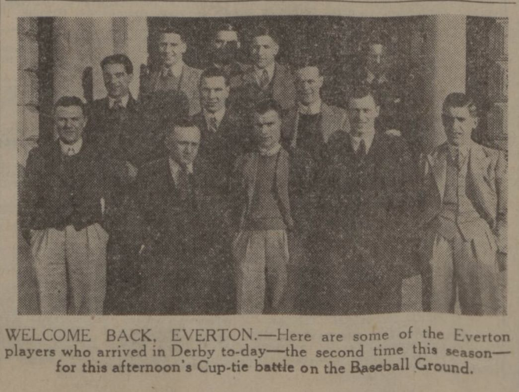 Now for the next round. Result Derby County nil Everton 1. Teams Derby County:- Boulton goal, Nicholas, and Rowe, backs, Hann, Bailey and ward, half-backs, Crooks, Ashley, McCulloch, Dix and Duncan, forwards. Everton: - Sagar, goal, Cook and Greenhalgh, backs, Mercer, Jones, and Thomson (captain) half-backs, Gillick, Bentham, Lawton, Stevenson, Boyes, forwards. Referee Mr. H.H.Jewell (London)