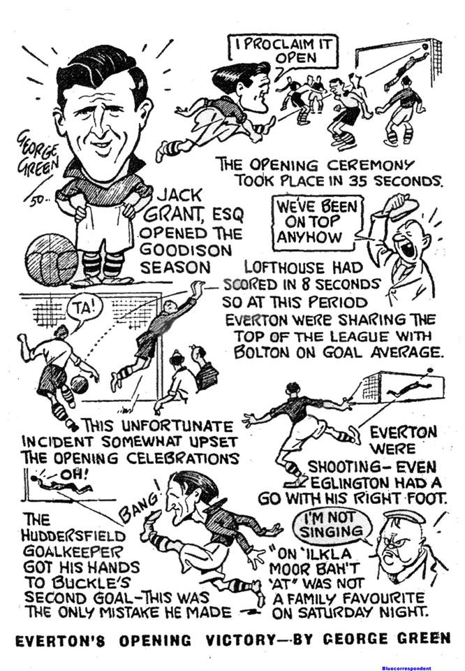 A good start, they say, is everything, and Everton had everything they could hope for in the first minute of the engaging meeting of clubs with a new lease of Division 1 life. The ball had barely moved from centre after a false start kick-off, when little Grant, coming up eagerly and with his usual purposefulness, drove the ball, left foot, into the further most crevice from Mills’ reach. But, Everton, suffered many apprehensive moments (not to mention those in which they deserved to score) before they nailed their men, by three goals to two. Huddersfield having countered leading goals twice and having near missed getting a third equalizer were “no” without credit and the margin was just –but only. The attendance numbered 51,000. “It was a game over which few could find fault, having all the qualities one hardly expects from a season-opening fixture. Speed, pattered attacking some stern and intelligent defence and goalkeepers who shook us (and themselves) in a mixture of good bad and right down indifferent. Mills who seemed so hazy about anything crossing him in the air, not only caught but held the Buckle cannon-shot which did everything but elude his grasp, he had further good fortune to find the convenient last line defender twice aiding him well all seemed lost.
